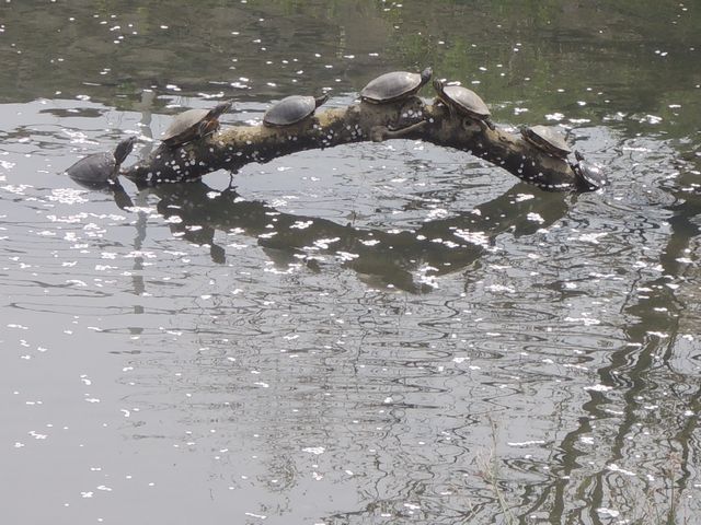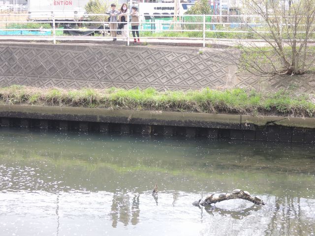 さらに歩を進めていくと、前原川が右手に分岐していく(合流点)辺りには、木の枝だか根だかが龍の背のように水面に顔を出しており、その上にデッカイ亀が何匹も並んで、甲羅干しをしていた(亀橋?)。